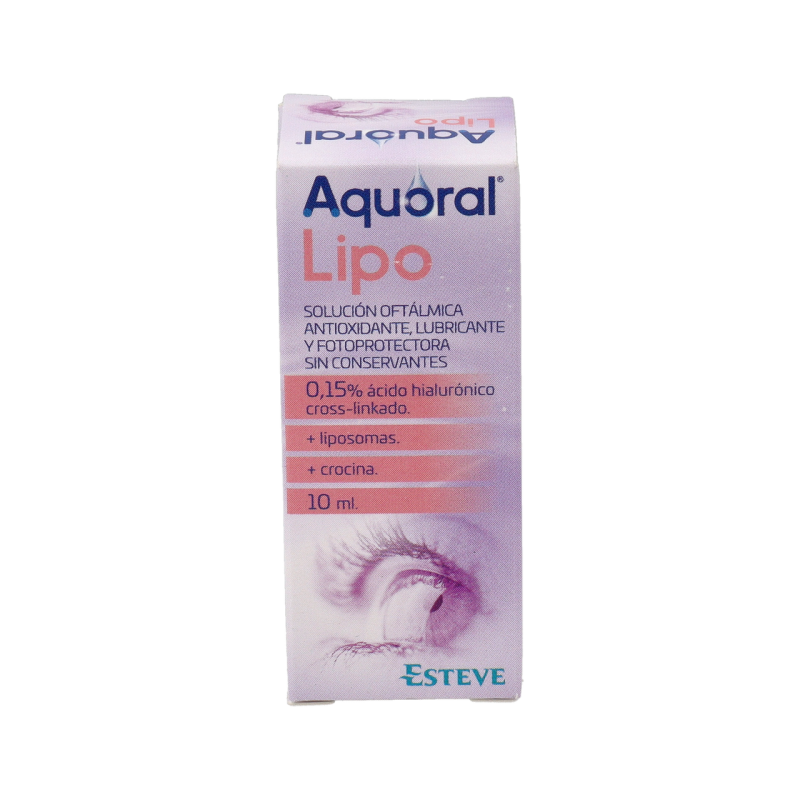 Aquoral Lipo es una solución oftálmica lubricante y antioxidante sin conservantes a base de sal sódica de ácido hialurónico cross-linkado, liposomas y crocina.