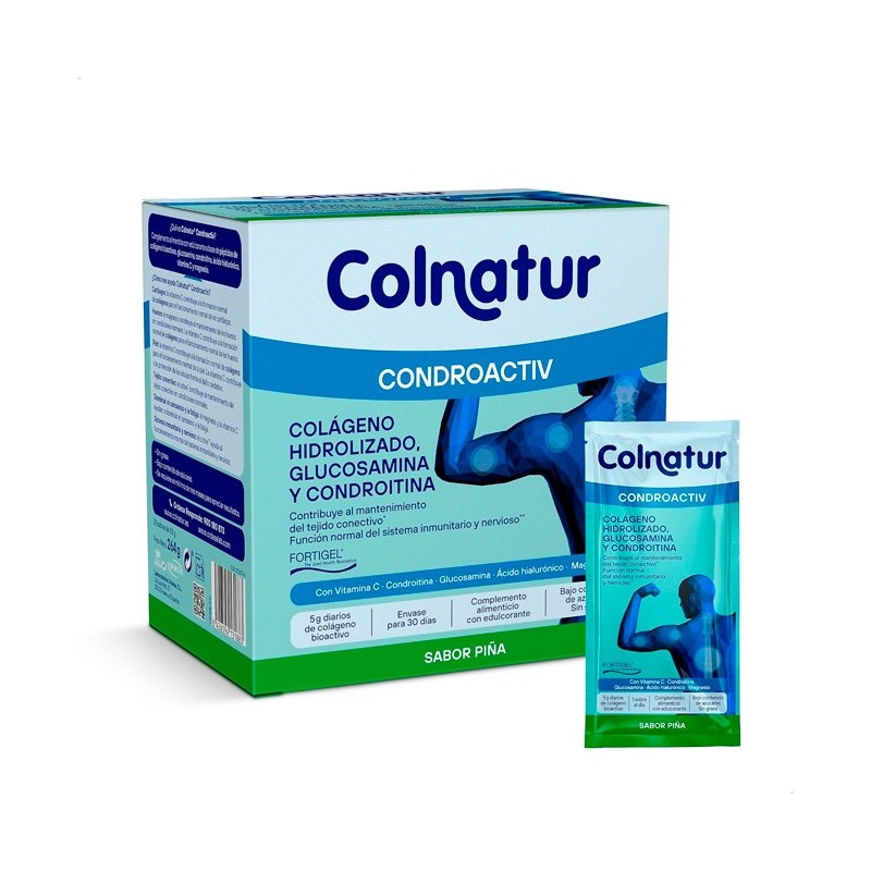 Colnatur Condroactiv es un complemento alimenticio a base de colágeno hidrolizado, glucosamina, condroitina, ácido hialurónico, vitamina C, magnesio y cobre. Estos ingredientes ayudan a mantener las articulaciones en buen estado y a mejorar su funcionamiento.