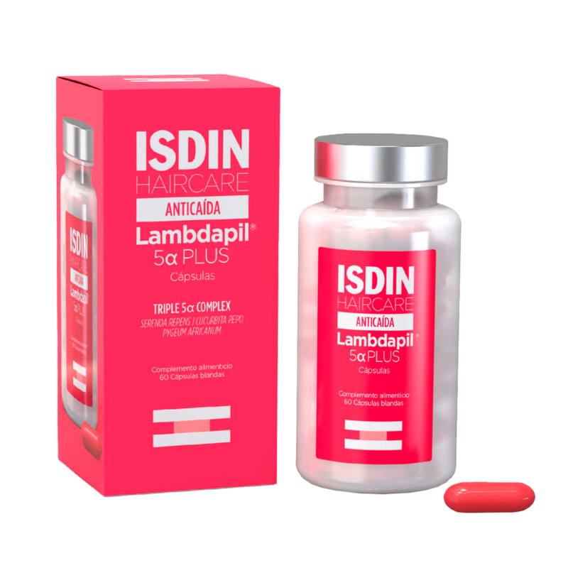 Isdin Haircare 5 alfa plus es un suplemento alimenticio anticaída formulado con 3 extractos naturales, Serenoa repens, Cucurbita pepo y Pygeum africanum, un triple 5 alfa complex que actúa reduciendo la caída hormonal por su acción sobre la enzima 5 alfa reductasa.