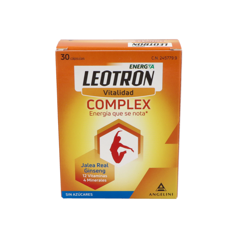 Leotron Complex de Angelini es un complemento alimenticio con Jalea real, Ginseng (Panax ginseng), 12 Vitaminas y 4 Minerales.