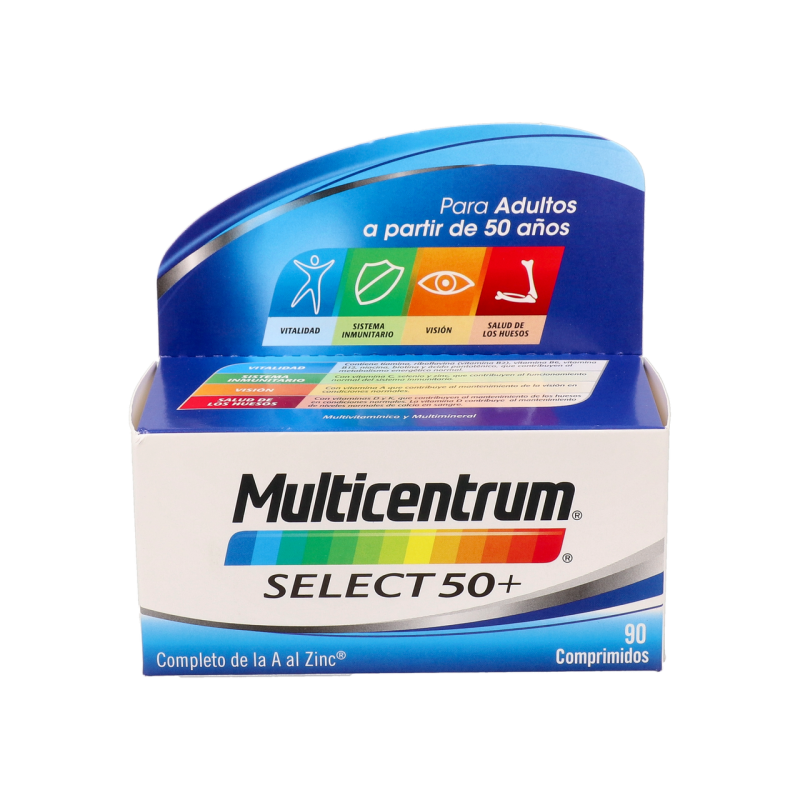 Multicentrum Select 50 es un complejo vitamínico que ayuda a cubrir aquellas necesidades que puedan surgir de vitaminas y minerales. Está indicado para adultos a partir de 50 años.