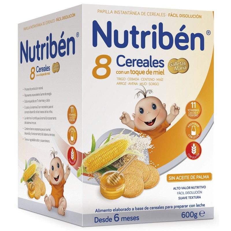 Nutribén 8 Cereales y Miel Galletas María, es una papilla ideal como complemento a la alimentación diaria de tu bebé. Elaborada con una selección de los mejores cereales (trigo, cebada, centeno, avena, arroz, maíz, mijo, sorgo), miel y Galletas María.